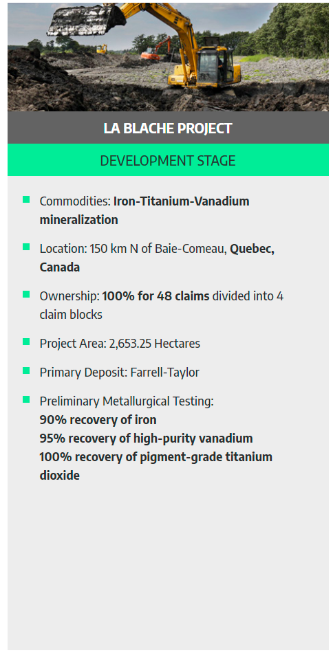 The company was attracted to La Blache because of the size and tenor of the deposit, and another advantage is that it is at the surface, making it amenable to open pit mining rather than underground. It is a bit of a unique opportunity in the fact that its grade and mineral composition make it attractive in various markets from base metal to specialty to battery metals. Additional metallurgical work needs to be done, but initial indications are that La Blache iron average grade is 41.76% and produces a desirable iron concentrate.(9)