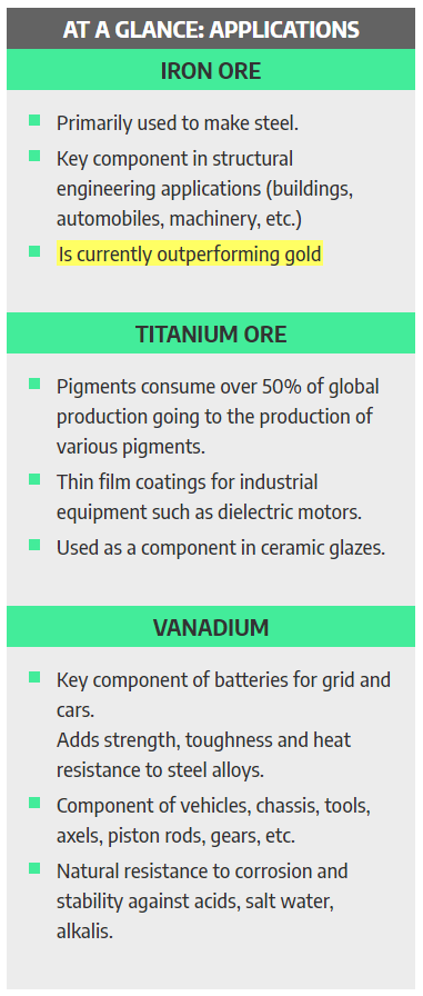 The third mineral is vanadium. While iron and titanium have steady industrial demand, vanadium has taken the pole position as a breakthrough ingredient for electric batteries.
